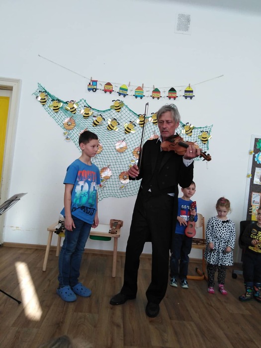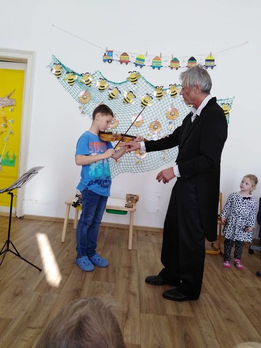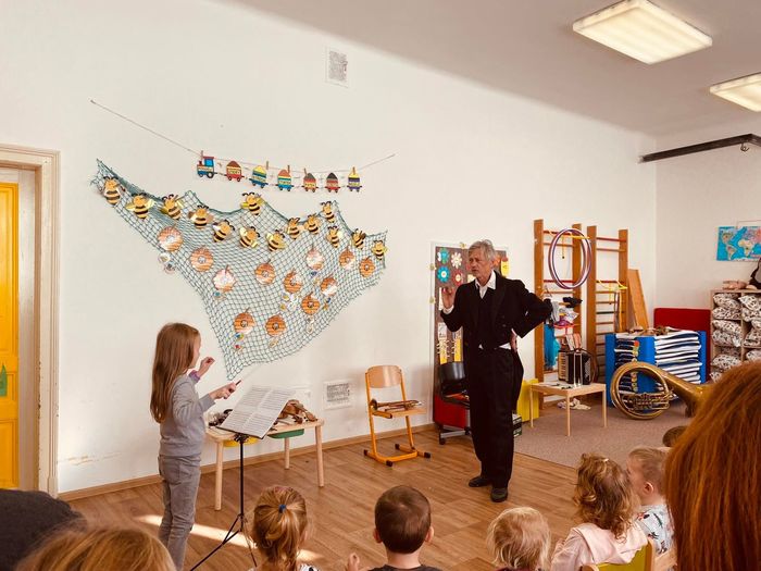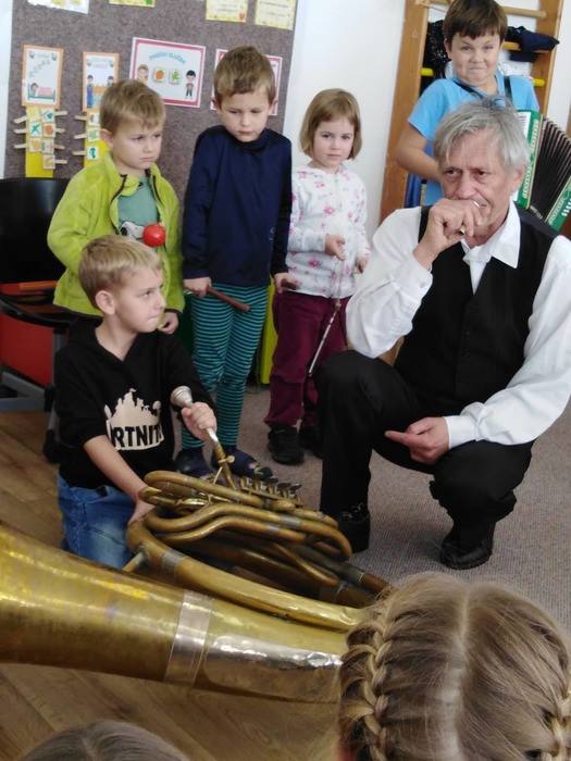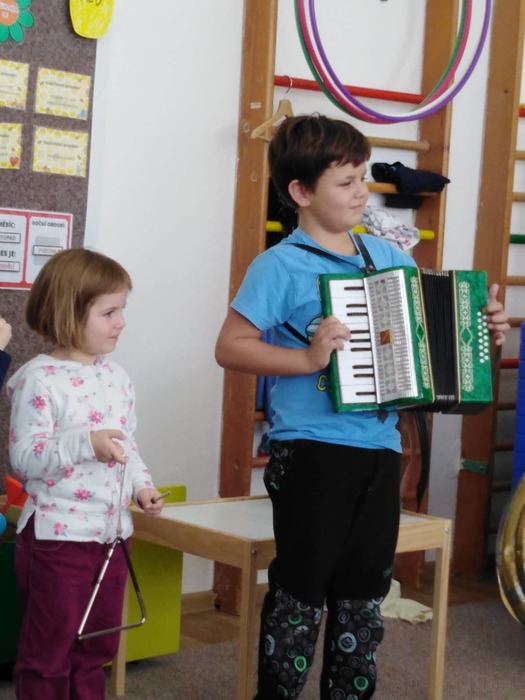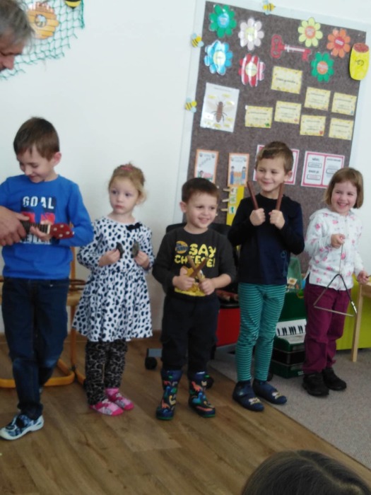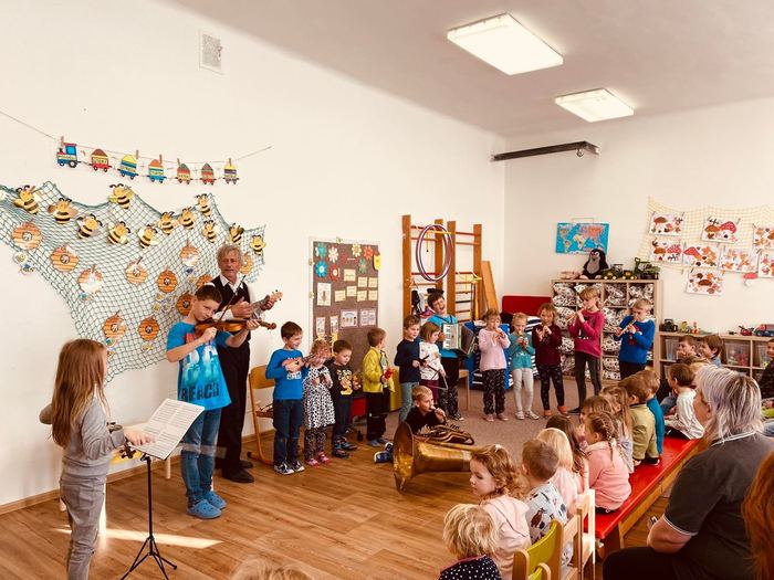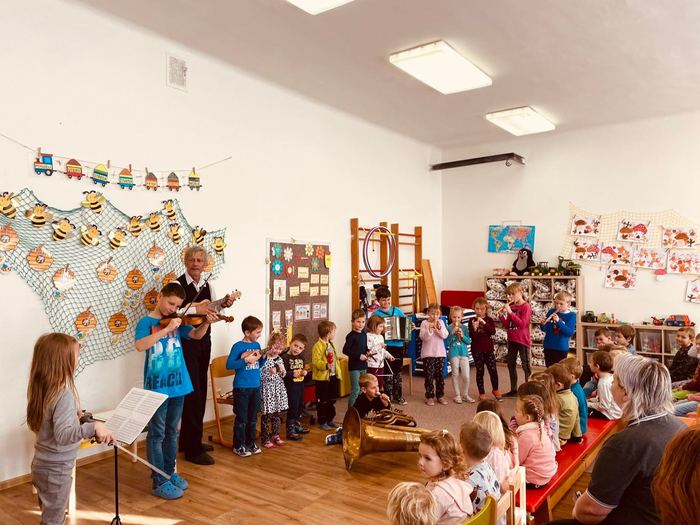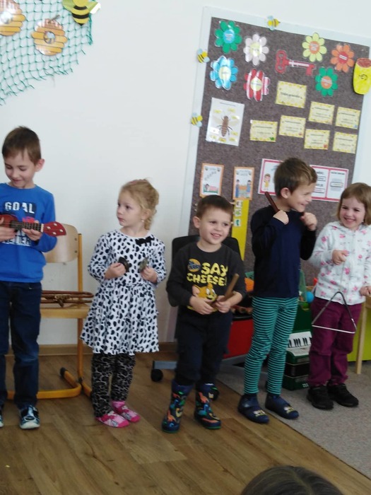 Všichni i se školáky si společně zazpívali a zamuzicírovali na různé hudební nástroje. Hudební pořad se všem moc líbil.